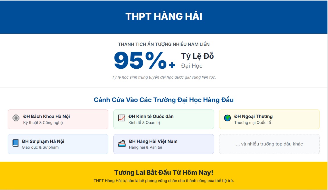Với truyền thống vững mạnh, chương trình giáo dục toàn diện và môi trường học đường thân thiện – hiện đại, Trường THPT Hàng Hải – Hải Phòng xứng đáng là lựa chọn tin cậy của phụ huynh và học sinh trên địa bàn thành phố.